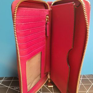 Red leather Michael Kors Wallet with wrist strap, zip compartment and clear card compartment. Like-new condition.