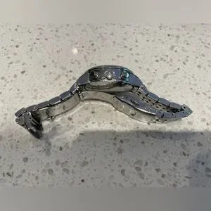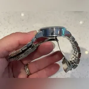 It features a silver mother of pearl dial with luminous hands and Swarovski crystal markers, fixed stainless steel textured bezel and a stainless steel case with a stainless steel bracelet. Quartz movement with Analog display.