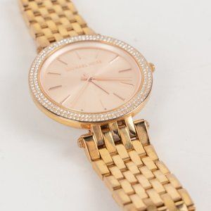 An analog rose gold-tone stainless steel chain strap watch from Michael Kors featuring a minimal numberless face and a pavé crystal encrusted bezel.