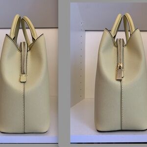 This is a boutique bag, purchased from the Michael Kors website. The interior lining with chain link detail, and the detailed MK purse charm indicates the boutique quality. This bag is in great condition. There is some minor scratches on the hardware (feet and snap closures), please see pictures. Also, there is a slight wear of the leather on the back of one of the handles, again, see pics. Lastly, there is a slight scratch on the front handle; there is a zoomed in picture indicating that as well. This bag comes with a long shoulder strap; it can be shortened as a shoulder bag or worn crossbody. It is a beautiful buttercup yellow in colour; the pictures with the deepest saturation reflects its true colour. This is a beautiful, sturdy bag. Especially nice for Spring and Summer. I tried to get as many detailed pictures as possible. If you have any questions, please ask.