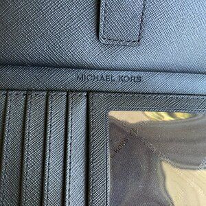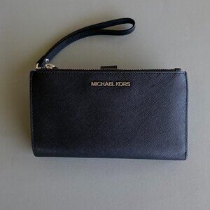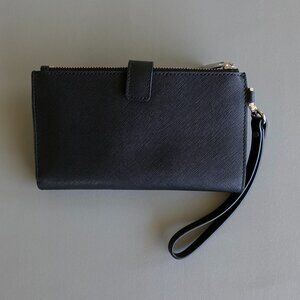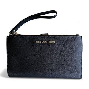 Michael Kors Black Saffiano Leather Double Zipper Wallet Wristlet. Top snap & zipper closure, detachable 7" leather wristlet strap, 6 card slots + id window, 6 3/4" x 3"phone pocket with snap closure, 2 slip pockets + paper/currency compartment. silver tone hardware. Wristlet is like new condition.