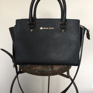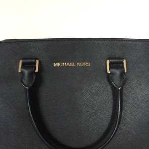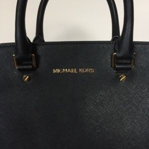 Bright saffiano leather with contrast edging and gold-tone hardware constructs this MICHAEL Michael Kors satchel. The inset top zip opens to a logo-lined interior with 3 pockets and a spring-lock keychain. Rolled leather handles. Optional, adjustable shoulder strap.