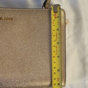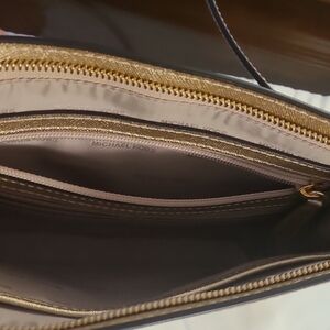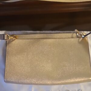 Stylish and versatile crossbody bag. Features a shimmering gold finish. Ideal for day or night outings.