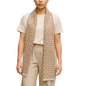 Keywords: Michael Kors scarf, signature print accessory, tan designer scarf