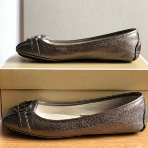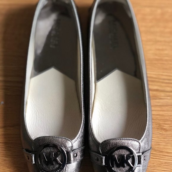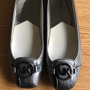 Genuine leather, silver Michael Kors flats in like-new condition! Only worn twice indoors. Very small scuff marks at the bottom of the heel.