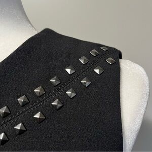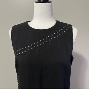 Excellent condition. Black sleeveless sheath style. Back zipper opening. Diagonal metal studded accents. Fully lined.