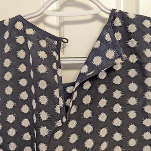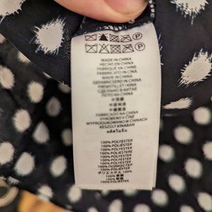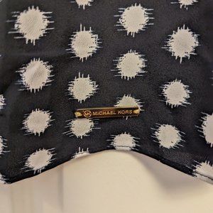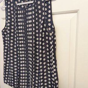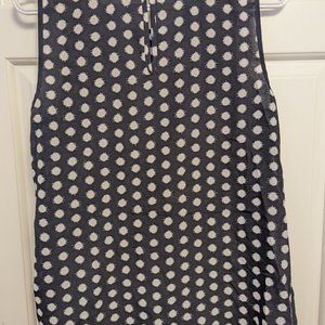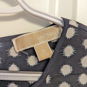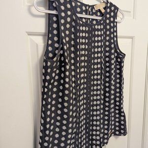 Size Small Michael Kors polka dot sleeveless top with gold fastener in the back. Very light material, good for spring/summer. It's dark navy in colour with white paintbrush-style polka dots and pleating in the front. Very wrinkle resistant. The bottom of the shirt has a nice curve (semi-circle). Excellent used condition.