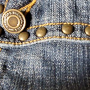 Michael Kors women's dark wash straight leg jeans in size 6 measures 15 inch waist & 29.5 inseam. Medium rise. Studded detail on front pockets and on flaps of back pockets. No stretch. Very good used condition.