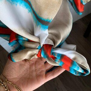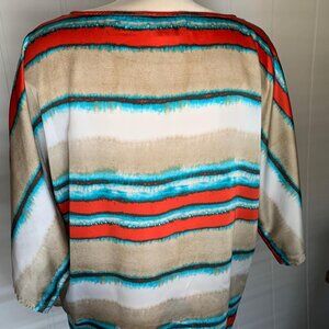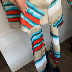 Michael Kors flowy blouse featuring bold stripes in red, navy, beige, black, and white. The side-tie hem detail adds a modern twist, making it perfect for dressing up or down.