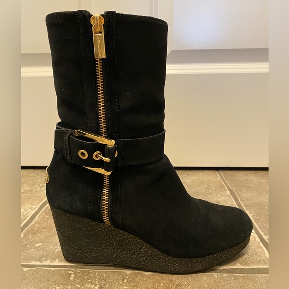 Suede wedge boots in black, with gold hardware by Michael Kors in the UK. They're super comfortable and I loved these boots but I haven't been reaching for these as much, so they need a new home. It has some markings as seen in the photos from salts but overall in really good condition. Clean and comes from smoke and pet free home.