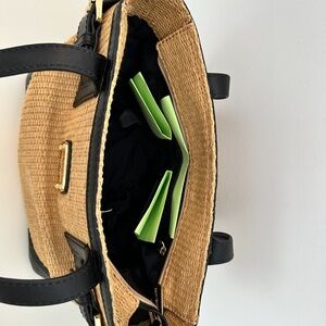 Stylish shoulder bag with tan woven texture. Accented with black leather trim. Features gold-tone hardware. Perfect for everyday use.