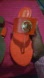 Chic tangerine slides with a bold gold emblem. Ideal for summer wear.