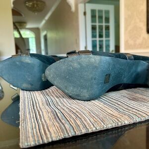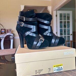 These Michael Kors Tatum Booties in Size 10 M are sexy and stunning boots. These boots are black suede with black leather strips and buckles. These boots look gorgeous and add glamour to any outfit. These boots are very comfortable, despite their high heels. These heel is wide and therefore very stable to walk in. These boots are in like new, pristine condition. They were only worn a couple of times (before breaking my back and ending my ability to wear high heels). They come in the box.