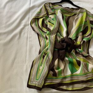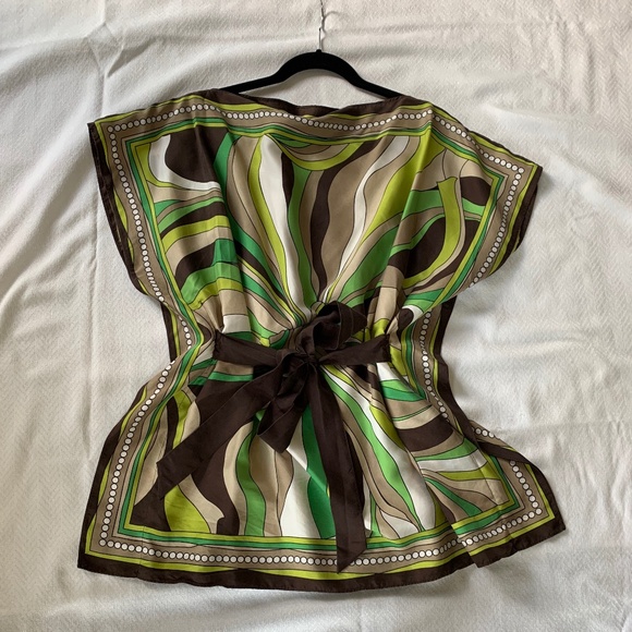 Details: A beautiful top which can also be worn as a swimsuit coverup. The fabric is so rich looking and the pattern very unique and modern. It is missing the brand and size tag.