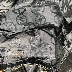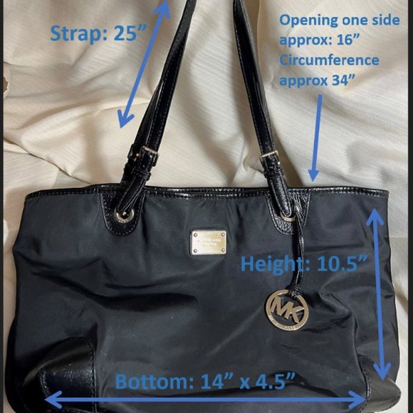 This beautiful Michael Kors Tote is in great condition. Comes with its gold metal monogram which dangles from the outside. Its monogrammed lining on the inside. Clean and in great condition. Bottom has a small smudge. Dimensions: Strap is approx 25” (63.5 cm) from top rim to shoulder, opening rim one side approx 16” (40.64 cm) and it’s circumference approx 34” (86.36 cm), body approx 10.5” (26.67) and bottom approx 14”x 4.5” (35.56 cm x 11.43).
