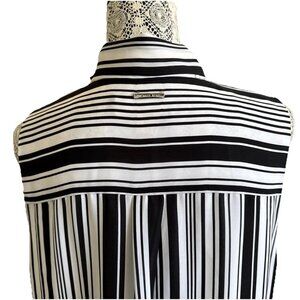 Step out in style with this stunning preowned Michael Kors tunic dress, featuring eye-catching black and white horizontal stripes that flatter any figure. With a sophisticated knee-length cut, this sleeveless design showcases a chic collared neckline and elegant silver buttons down the front, making it perfect for both casual outings and more formal occasions.