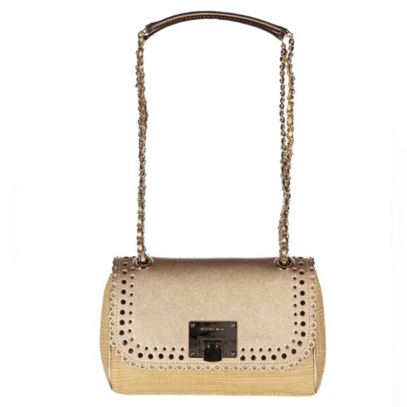 Michael Kors Violet Vivian Leather Straw Raffia Metallic Chain Shoulder Bag Tote Gold