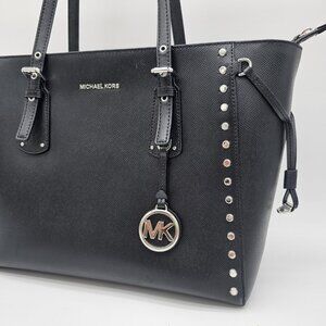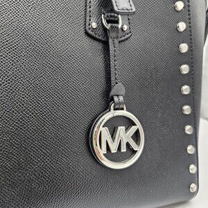 The exterior is adorned with Silver hardware and a MK logo charm, adding a touch of elegance to the overall design. The bag also features multiple interior pockets for organization and a top zip closure to keep your belongings secure.