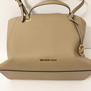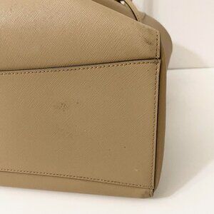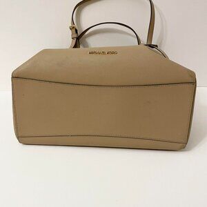 This purse is pre-owned and in used condition. The bag is misshapen, it has lost its shaped due to storage. The inside Michael Kors tag is loose from the inner lining. There are stains and scuffs on the outside and inside of the bag. Please see all photos for exact item.