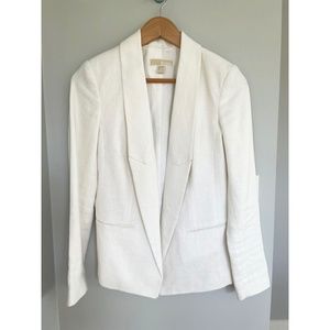 This white linen blazer by Michael Korn is in excellent condition and has a tuxedo-style silhouette. Crafted from high-quality material, this blazer is sure to be a timeless piece in your wardrobe.