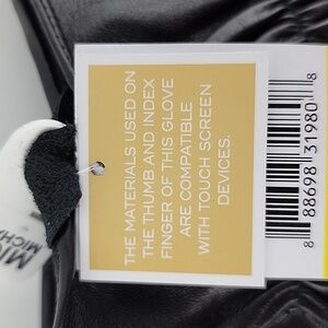 New with tags, Michael Kors women's winter gloves in a supple black quilted leather, soft fleece lining and signature gold MK logo on the cuff of the right glove, size medium.
