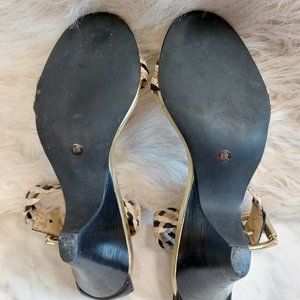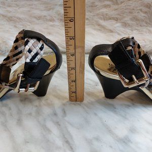 Check out these Michael Kors Women's Black Weaving Strapped High Heel Open Toe Sandals in great pre-owned condition, some wear on the outsole and the trimming, the upper, the insole and gold tone buckle still in great shape.