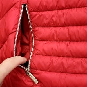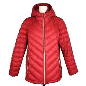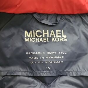 Excellent pre-owned condition, Michael Kors women's red down filled quilted puffer winter coat jacket with gold-tone hardware, cozy down insulated hood and two layered collar to keep heat in and two front pockets, size 1X.