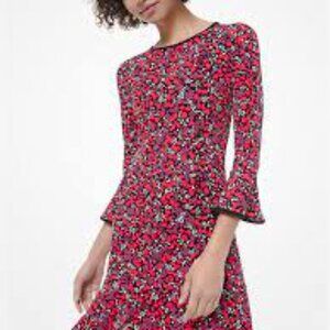 Michael Kors Woodland Red Leaf-Print Matte-Jersey Flounce Dress