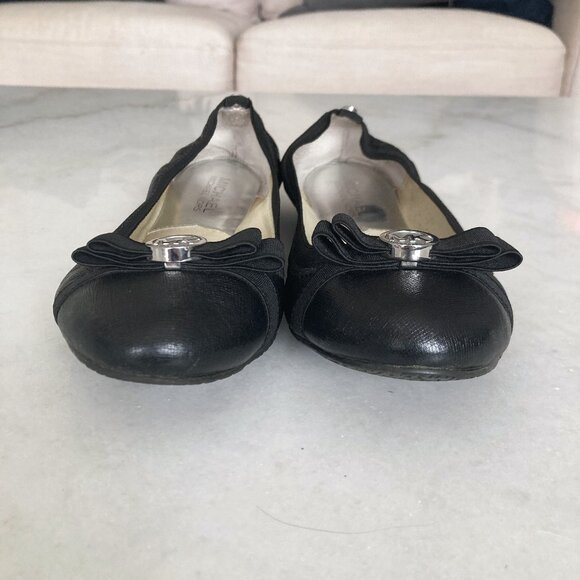Michael Kors black ballet flats / shoes with bows, silver MK logo, leather