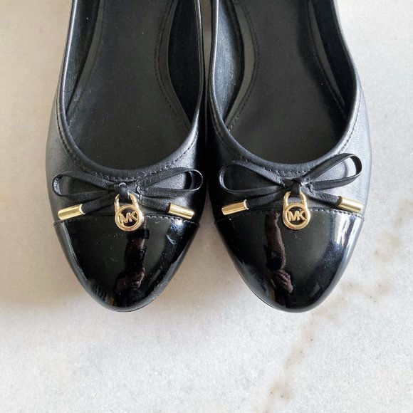 Super cute black leather flats, shiny patent leather tips, w/ gold hardware trim (padlock w/ MK logo, gold chain link around heels, ends of bows)
