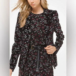 A nod to bohemian style, this fitted blazer is designed in a botanical print that enlivens the luxe velvet construction.