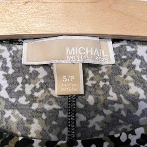 Michael Kors "camo" print top/blouse in size Small - this gorgeous top packs perfectly (not creasing), has elegant/playful/flirty detailing along sleeves and sides (see photos), looks wonderful on its own or under a blazer, camouflage design. NOTE: I usually wear medium or sometimes large, but this top fit me perfectly!