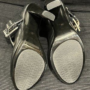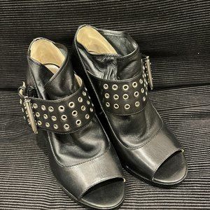 High-heeled booties with an open toe. Elastic at the buckle so has some flex. Worn once for event. Have lived in a box since then so look and feel new. (The original price is an estimate. Purchased for me and they remember 239) They need a badass new home for someone that can pull them off.