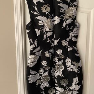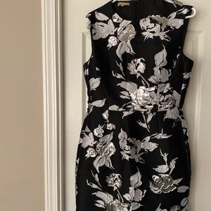 A knee length Michael Kors pencil dress. On the fancier side with shiny silver roses. Black grey and silver.