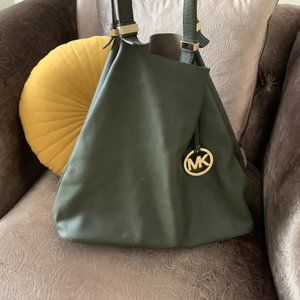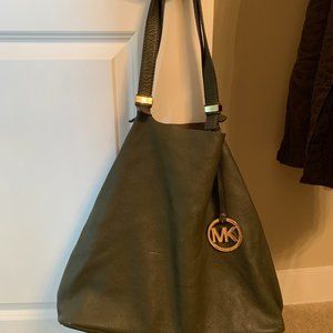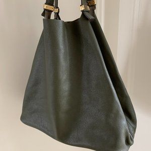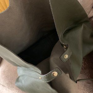 Very nice bag a subtle green, light and carrys alot. Gold hardware with leather fastening. Inside is suede leather.