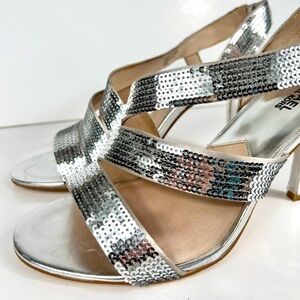 Micheal Kors sequin silver strappy heels, size 10, 4” slingback with satin elasticized ankle strap, worn once, like NEW, perfect condition
