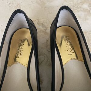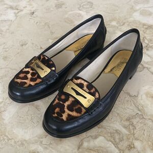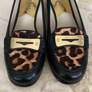 In excellent preowned condition classic, elegant loafers from Michael Kors. Beautiful black leather and leopard print piney hair with branded gold tone embellishment.