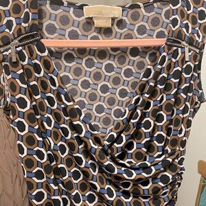 Perfect condition. Has cute small zipper accents on front shoulders. Black, brown, white, and blue circle pattern.