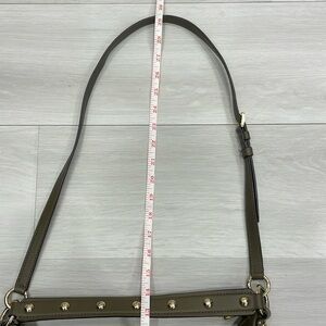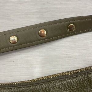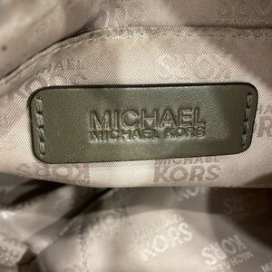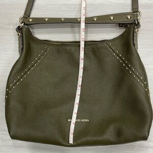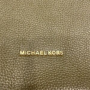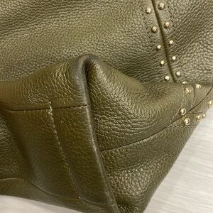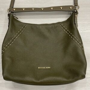 Michael Michael Kors Aria bag in green soft saffiano pebbled leather with gold toned hardware and stud detailing, zipper closure, studded shoulder strap and long adjustable/removable strap. Fabric logo lined interior with smaller pockets inside. Very good pre owned condition with some wear to the bottom corners, some marks/ discolouration on interior lining (mostly near the top zipper closure), some scuffing/scratches/discolouration to the studs on the shoulder strap (some on the top, mostly on the underside). Some light wear to the main zipper pull. Please see photos, mare for reference only. Reasonable offers welcome!