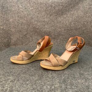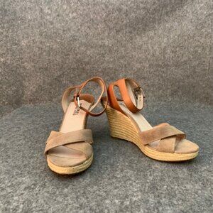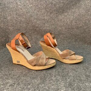 Michael Michael Kors Brown Tan Leather Suede Ankle Strap Peep Toe Wedge Sandals