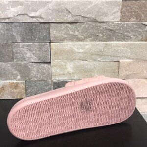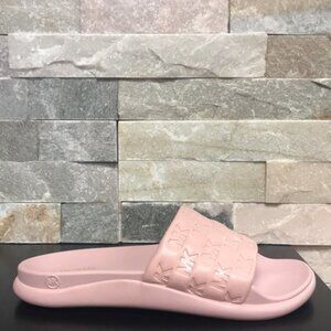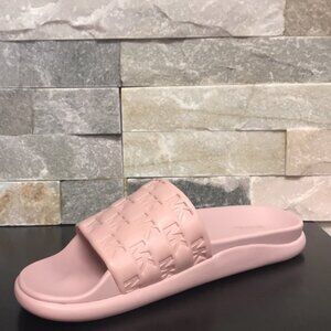 Debossed branding marks the strap on this slide sandal with a contoured footbed for staying comfortable while lounging poolside.