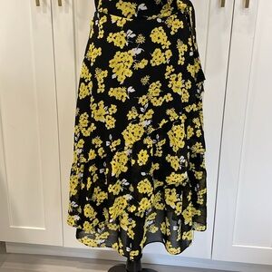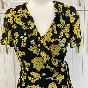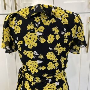 Michael Michael Kors black yellow and white floral wrap dress with ruffle detail, short sleeves, v neckline. Attached waistband tie straps, two clasps along the neckline. Size small. Good pre owned condition! Please see photos. Reasonable offers welcome!