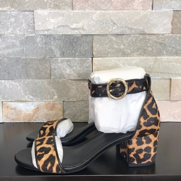 Minimalist style is elevated to an exotic level with cheetah-printed genuine calf hair in the Lena Flex Mid sandals from Michael Michael Kors.