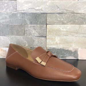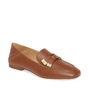 A bow with metal logo tips gives luxe branding to a square-toe loafer with a soft back for easy slipping on and off.