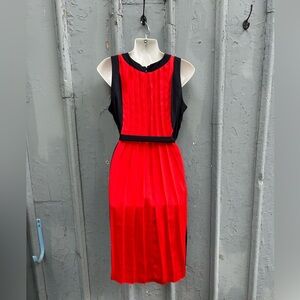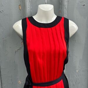 Bold red and black sleeveless pleat front dress from Michael Michael Kors. Pleat front detailing and tie waist.