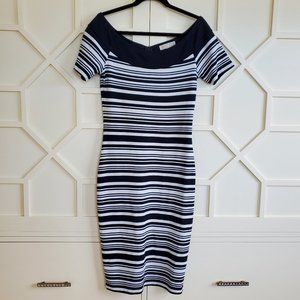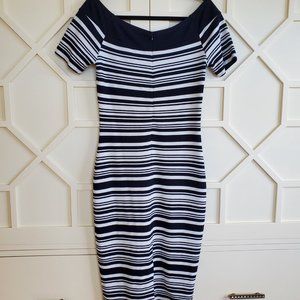 Michael Michael Kors short sleeve striped midi-dress; neckline can be off-shoulder or just sitting on shoulders; invisible zipper at back; black & white stripes. size Medium. never worn!