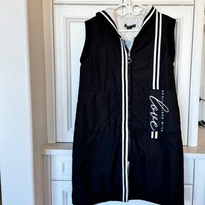 Add a touch of sporty elegance to your wardrobe with this Michael Tyler Collections sleeveless hooded vest. Features a full front zip, stylish striped trim detailing, and a modern “Always with Love” print along the zipper line. The black-and-white contrast design gives it a chic, versatile look — perfect for layering over casual or athleisure outfits.