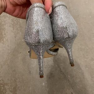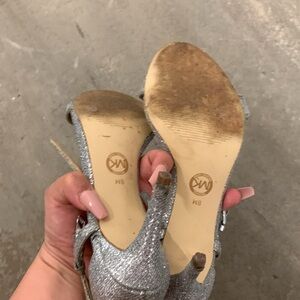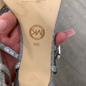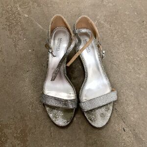These sophisticated Michael Kors heels feature a sleek silver finish and a minimalist design with a thin stiletto heel and an elegant ankle strap. Perfect for formal occasions, their timeless silhouette and versatile color make them a stylish choice for any event.