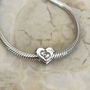 Beautiful Michael Hill charm bracelet bead in sterling silver and 10K yellow gold. This pretty bead will fit Pandora and other similar styles. Gorgeous Sterling silver heart with a 10K yellow gold ribbon on it, on the reverse side it has two interlocking hearts.
