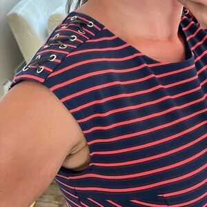 Michael Kors Sz medium knit dress in EUC with no stains, damage or wear detected. Navy with red stripes and shoulder lace detail to add interest. Great layering piece. Close fit and darted with stretch to show curves, knee length, sleeveless with zipper closure in back and clean silhouette. Wear as daywear, business wear, showers, or any event you need to be "dressed". Build your look with finishing pieces from Our Closet (some suggestions shown all listed and priced separately), make a bundle, save a bundle! There's always something Fresh at Lemon Squeezy Shop🍋